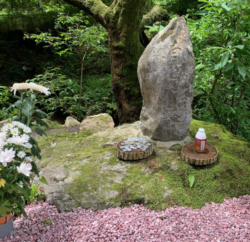 第25回「篤太夫、帰国する」放送後、旧渋沢邸「中の家」にある渋沢平九郎追懐碑の献花台には多くの花が供えられていました(2021.8.29撮影)